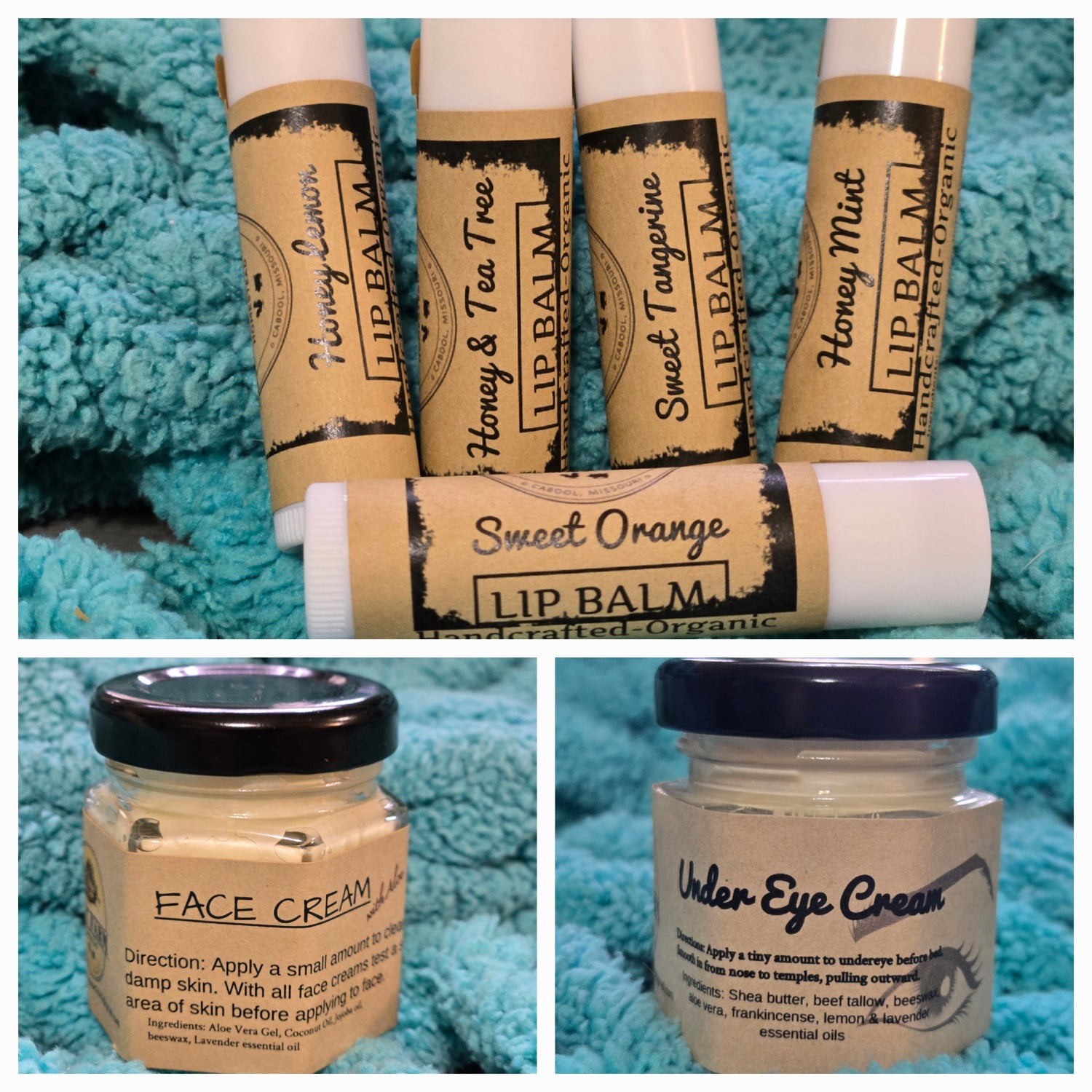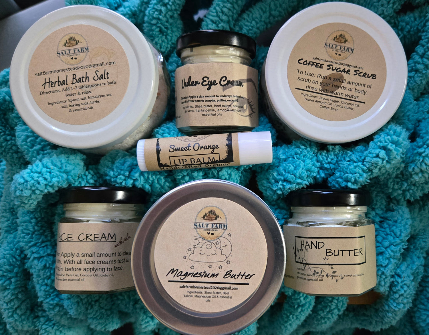 Under Eye Cream, Face Cream with Aloe, Herbal Bath Salts, Hand Butter.